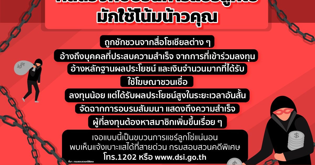 จำไว้เลยเจอแบบนี้เป็นขบวนการแชร์ลูกโซ่แน่นอน พบเห็นแจ้งเบาะแสได้ที่สายด่วน กรมสอบสวนคดีพิเศษ โทร.1202 หรือ