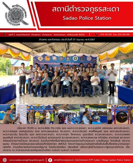 7 มิถุนายน 2567 เวลา 10.00 น. พ.ต.อ.พิชัย กิระวานิช รอง ผบก.ภ.จว.สงขลา, พ.ต.อ.สุรจิต เพชรจอม ผกก.สภ.สะเดา, พ.ต.ท.สายชล เพชรสุวรรณ รอง ผกก.(สอบสวบ) สภ.สะเดา, พ.ต.ท.ปิยวุฒิ พงศ์ไพบูลย์ รอง ผกก.สส.สภ.สะเดา, พ.ต.ท.ชนาวิน รัตนาวิน รอง ผกก.ป.สภ.สะเดา, พ.ต.ท.หญิง จีรพรรณ บุษรารัตน์ สว.อก.สภ.สะเดา, พ.ต.ต.อวยพร อุบลพันธ์ สวป.สภ.สะเดา, พ.ต.ต.จีรวัฒน์ สุวรณมณี สว.สส.สภ.สะเดา, พ.ต.ต.สมหมาย แก้วอ่อน สวป.(ชส.) สภ.สะเดา พร้อมด้วยข้าราชการตำรวจ สภ.สะเดา ร่วมกับภาคีเครือข่ายหน่วยงานราชการอำเภอสะเดา นายสัญญา รัตนพันธ์ ประธานชุมชน ดำเนินการเปิดและลงนามในบันทึกข้อตกลง (MOU) โครงการชุมชมบำบัดอย่างยั่งยืน ในพื้นพื้นที่แพร่ระบาดของยาเสพติด ตามนโยบายเร่งด่วนของรัฐบาล โดยมีนายคล่อง เรื่องสังข์ ปลัดอาวุโสอำเภอสะเดา/ผู้แทนนายอ๋าเภอ เป็นประธาน ณ ศาลาอเนกประสงค์ ชุมชนบ้านไพร ต.สะเดา อ.สะเดา จ.สงขลา