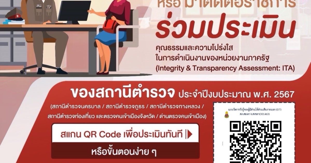 ขอเชิญผู้มารับบริการหรือมาติดต่อราชการ สถานีตำรวจภูธรสะเดา ร่วมประเมินคุณธรรมและความโปร่งใสในการดำเนินงานของหน่วยงานภาครัฐ (Integrity and Transparency Assassment : ITA) ประจำปีงบประมาณ พ.ศ.2567