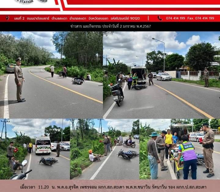2 ม.ค.67 เวลา 11.20 น. พ.ต.อ.สุรจิต เพชรจอม ผกก.สภ.สะเดา พ.ต.ท.ชนาวิน รัตนาวิน รอง ผกก.ป.สภ.สะเดา พ.ต.ต.อวยพร อุบลพันธ์ สวป.สภ.สะเดา พ.ต.ต.สมหมาย แก้วอ่อน สวป.(ชส.) สภ.สะเดา ช่วยเหลือประชาชนประสบเหตุรถจักรยานยนต์ชนกับรถยนต์ มีผู้ได้รับบาดเจ็บเล็กน้อย โดยเหตุเกิดบริเวณ ถ.บ้านยางเกาะ ต.ปริก อ.สะเดา จ.สงขลา แจ้งรถพยาบาล นำผู้บาดเจ็บส่งโรงพยาบาลสะเดา ต.สะเดา อ.สะเดา จ.สงขลา
