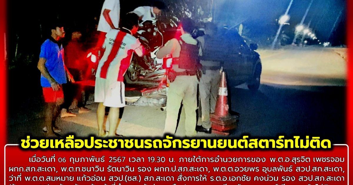 ว่าที่ พ.ต.ต.สมหมาย แก้วอ่อน สวป.(ชส.)สภ.สะเดา สั่งการให้ ร.ต.อ.เอกชัย คงน่วม รอง สวป.สภ.สะเดา (ร้อยเวร 20) พร้อม ว.30 ช่วยเหลือประชาชนรถจักรยานยนต์เสีย สตาร์ทไม่ติด บริเวณบ้านหลักสาม ได้ดำเนินการช่วยเหลือนำส่งบ้านพัก