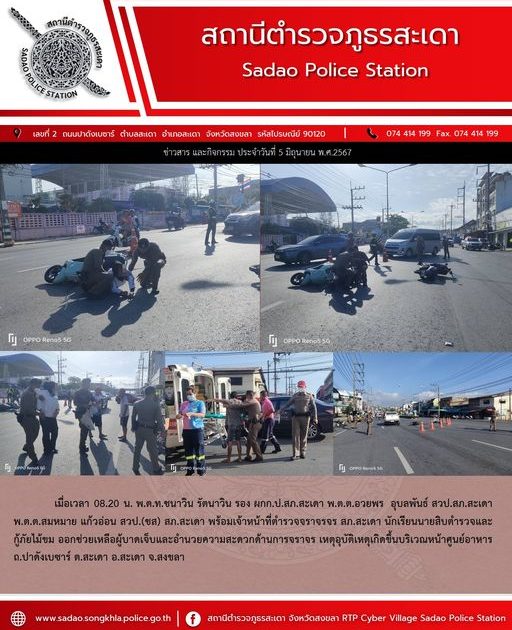 5 มิถุนายน 2567 เวลา 08.20 น. พ.ต.ท.ชนาวิน รัตนาวิน รอง ผกก.ป.สภ.สะเดา พ.ต.ต.อวยพร อุบลพันธ์ สวป.สภ.สะเดาพ.ต.ต.สมหมาย แก้วอ่อน สวป.(ชส) สภ.สะเดา พร้อมเจ้าหน้าที่ตำรวจจราจร นักเรียนนายสิบตำรวจ และกู้ภัยไม้ขม ออกช่วยเหลือผู้บาดเจ็บและอำนวยความสะดวกด้านการจราจร เหตุอุบัติเหตุเกิดขึ้นบริเวณหน้าศูนย์อาหาร ถ.ปาดังเบซาร์ ต.สะเดา อ.สะเดา จ.สงขลา