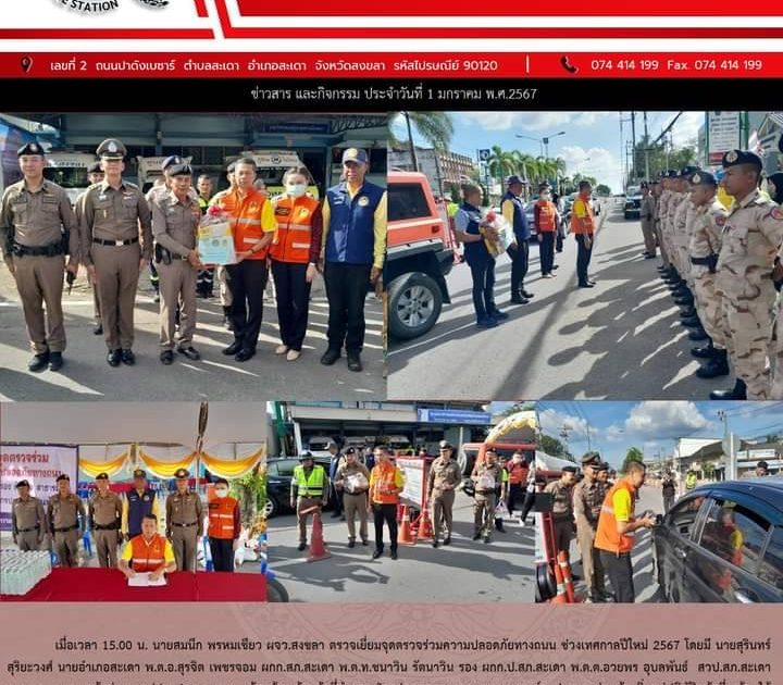 1 ม.ค.67 เวลา 15.00 น. นายสมนึก พรหมเขียว ผวจ.สงขลา ตรวจเยี่ยมจุดตรวจร่วมความปลอดภัยทางถนน ช่วงเทศกาลปีใหม่2567 โดยมีนายสุรินทร์ สุริยะวงศ์ นายอำเภอสะเดา พ.ต.อ.สุรจิต เพชรจอม ผกก.สภ.สะเดา พ.ต.ท.ชนาวิน รัตนาวิน รอง ผกก.ป.สภ.สะเดา พ.ต.ต.อวยพร อุบลพันธ์ สวป.สภ.สะเดา พ.ต.ต.สมหมาย แก้วอ่อน สวป.(ชส.) สภ.สะเดา พร้อมด้วยเจ้าหน้าที่ตำรวจ ฝ่ายปกครอง สาธารณะสุข และองค์กรปกครองส่วนท้องถิ่น อยู่ปฏิบัติหน้าที่ พร้อมได้แจกน้ำดื่มให้กับประชาชน เนื่องในเทศกาลวันปีใหม่ 2567 บริเวณหน้าศูนย์จราจร ถ.กาญจนวนิช ต.สะเดา อ.สะเดา จ.สงขลา