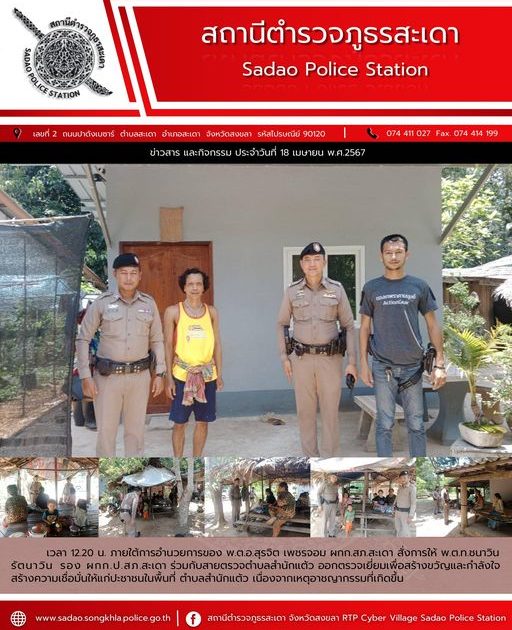 18 เม.ย.67 เวลา 12.20 น. ภายใต้การอำนวยการของ พ.ต.อ.สุรจิต เพชรจอม ผกก.สภ.สะเดา สั่งการให้ พ.ต.ท.ชนาวิน รัตนาวิน รอง ผกก.สภ.สะเดา ร่วมกับสายตรวจตำบลสำนักแต้ว ออกตรวจเยี่ยมเพื่อสร้างขวัญและกำลังใจ สร้างความเชื่อมั่นให้แก่ประชาชนในพื้นที่ ตำบลสำนักแต้ว เนื่องจากเหตุอาชญากรรมที่เกิดขึ้น