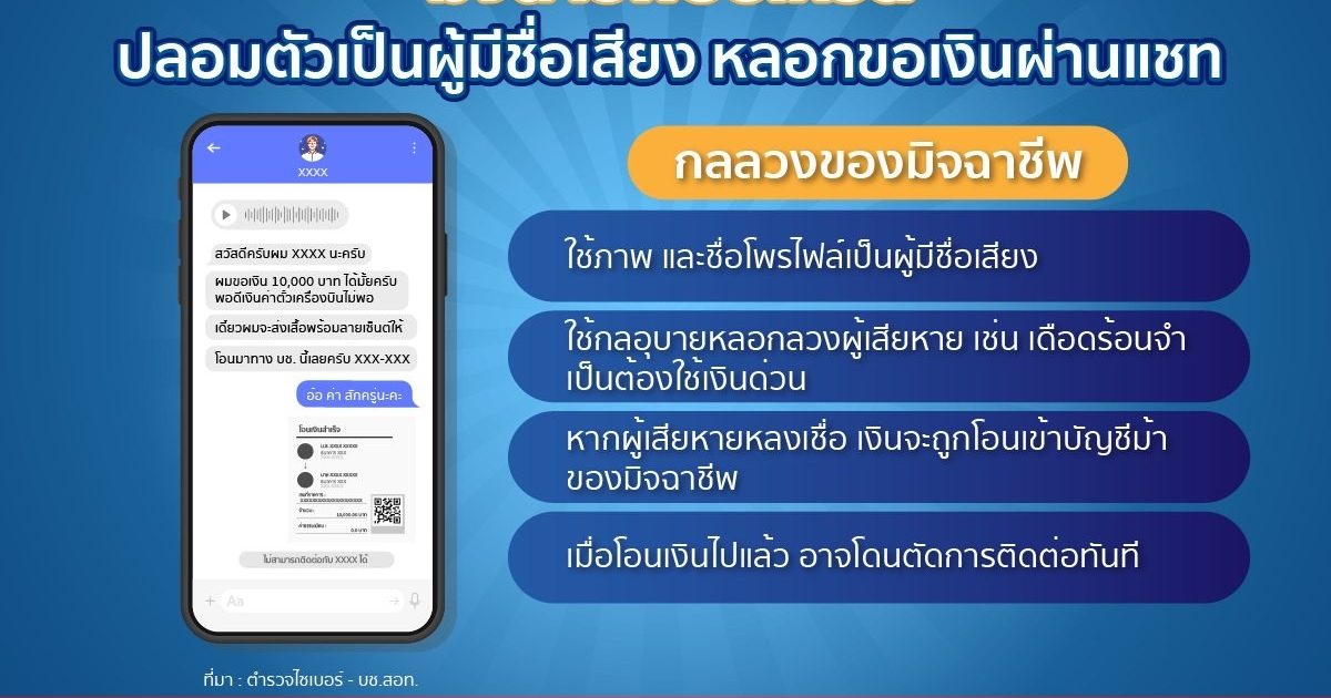 มิจฉาชีพอัปเกรด ปลอมตัวเป็นคนมีชื่อเสียง หลอกขอเงินผ่านแชท