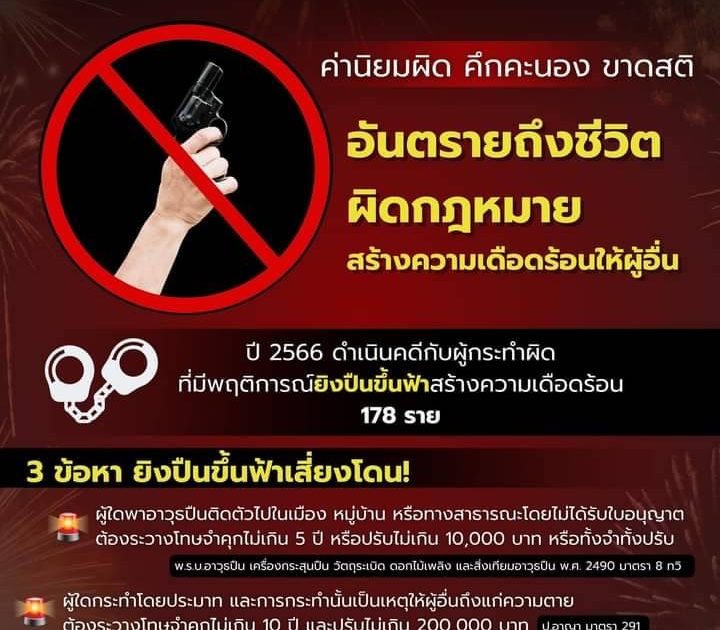 รอง โฆษก ตร.เตือน ‘ยิงปืนขึ้นฟ้า’ เฉลิมฉลองเทศกาลปีใหม่ ก่อให้เกิดอันตรายถึงชีวิต ผิดกฎหมาย และสร้างความเดือดร้อนให้ผู้อื่น ขอความร่วมมือประชาชน ให้ความร่วมมือเป็นหูเป็นตา