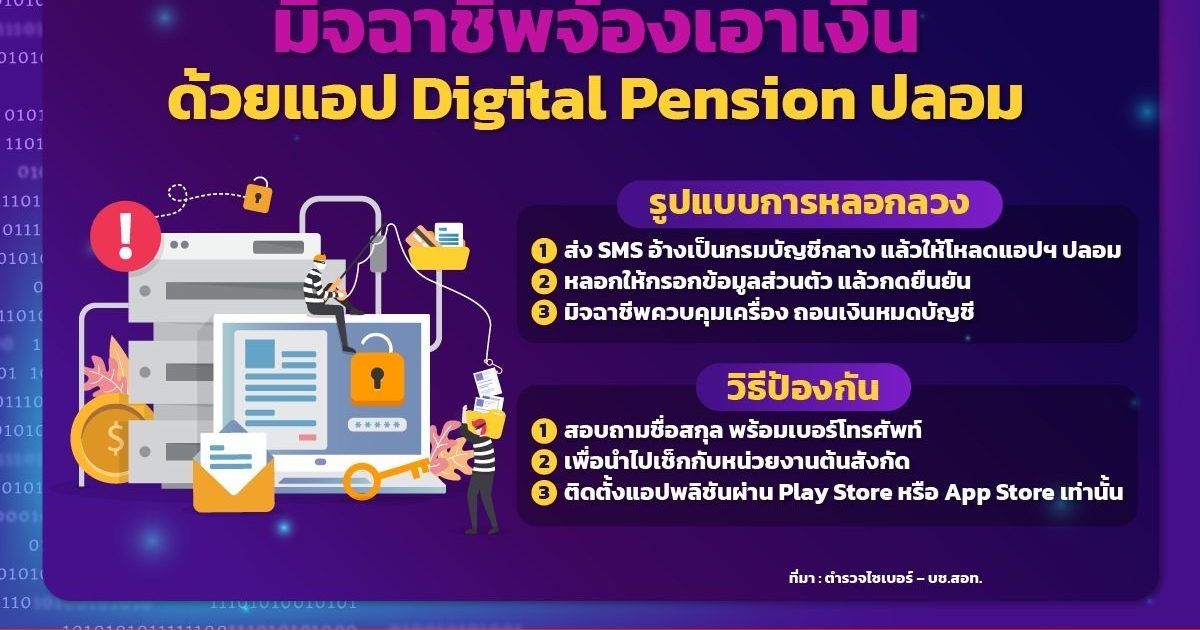 แอปฯ ปลอมขึ้นมามากมาย โดยล่าสุดต้องระวังแอป Digital Pension ปลอม ซึ่งเป็นอีก 1 ช่องทางที่มิจฉาชีพจ้องจะเอาเงินจากคุณไปด้วยวิธีการ ดังนี้