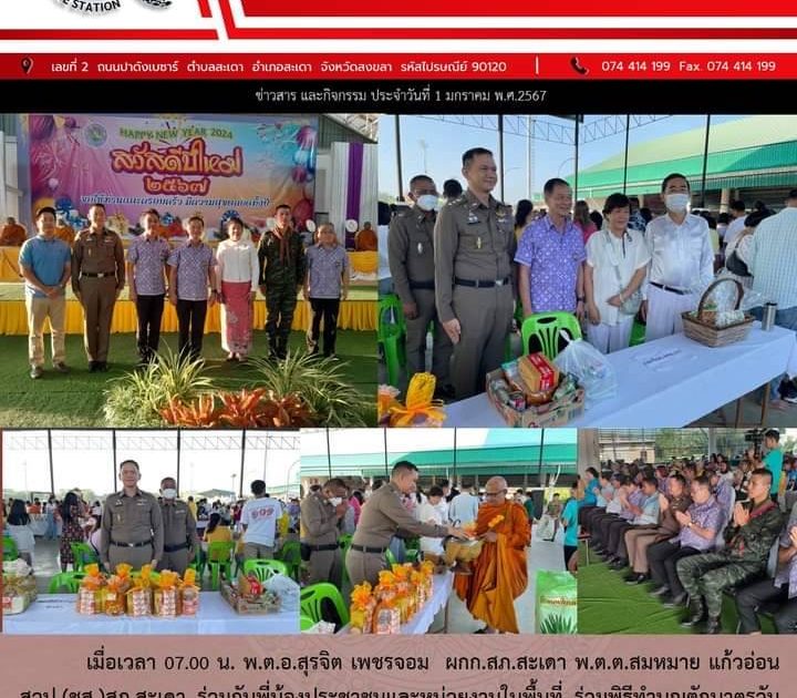 1 ม.ค.2567 เวลา 07.00 น. พ.ต.อ.สุรจิต เพชรจอม ผกก.สภ.สะเดา พ.ต.ต.สมหมาย แก้วอ่อน สวป.(ชส.) สภ.สะเดา ร่วมกับพี่น้องประชาชนและหน่วยงานในพื้นที่ ร่วมพิธีทำบุญตักบาตรวันขึ้นปีใหม่ ประจำปี พ.ศ.2567 ณ ศูนย์พัฒนาคุณภาพชีวิตและส่งเสริมอาชีพผู้สูงอายุ ต.สะเดา อ.สะเดา จ.สงขลา