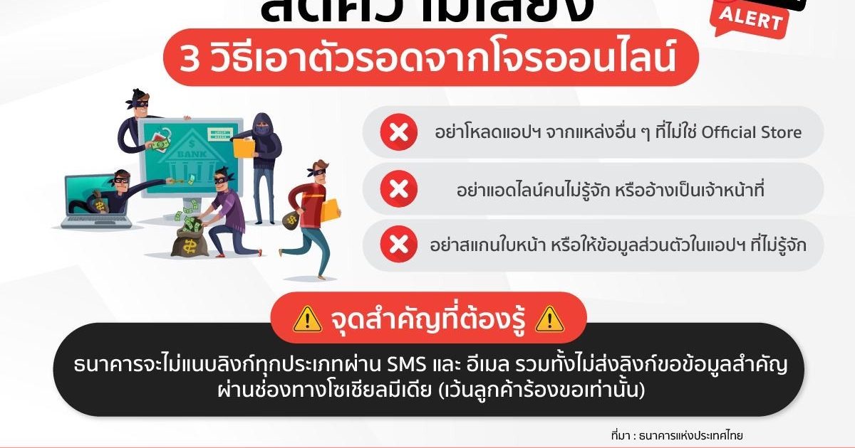 ธนาคารจะไม่แนบลิงก์ทุกประเภทผ่าน SMS และ อีเมล รวมทั้งไม่ส่งลิงก์ขอข้อมูลสำคัญผ่านช่องทางโซเชียลมีเดีย (ยกเว้นกรณีลูกค้าร้องขอด้วยตัวเองเท่านั้น)