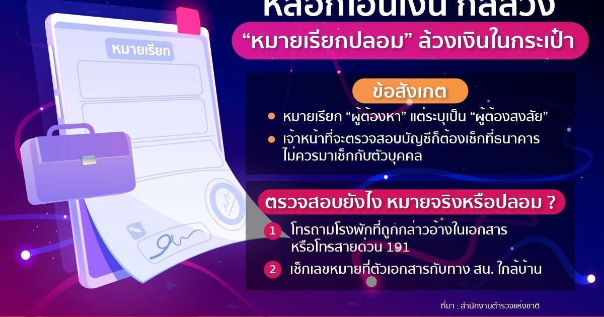 หลอกโอนเงิน กลลวง “หมายเรียกปลอม” ล้วงเงินในกระเป๋า