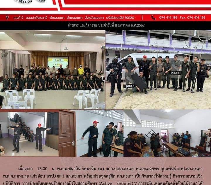 8 ม.ค.67 เวลา 13.00 น. พ.ต.ท.ชนาวิน รัตนาวิน รอง ผกก.ป.สภ.สะเดา พ.ต.ต.อวยพร อุบลพันธ์ สวป.สภ.สะเดา พ.ต.ต.สมหมาย แก้วอ่อน สวป.(ชส.) สภ.สะเดา พร้อมด้วยชุดครูฝึก สภ.สะเดา เป็นวิทยากรให้ความรู้กิจกรรมอบรมเชิงปฏิบัติการการป้องกันเหตุคนร้ายการยิงในสถานศึกษาการระงับเหตุคนคุ้มคลั่งด้วยไม้ง่ามให้ความรู้ในด้านการป้องกันอาชญากรรมทางเทคโนโลยีแก่นักศึกษาวิชาทหาร ร.ร.สะเดาขรรชัยค์กัมพลานนท์อนุสรณ์ ต.สะเดา อ.สะเดา จ.สงขลา
