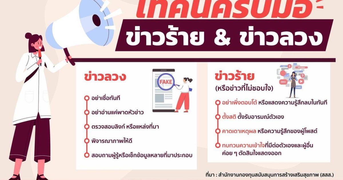 วิธีรับมือข่าวลวง (Fake News) และข่าวร้าย (Bad News) ในช่วงที่เราถูกห้อมล้อมด้วยข่าวสารมากมาย ทางเพจเลยรวบรวมเทคนิคการตรวจสอบข่าวและข้อมูลให้ชัวร์ก่อนแชร์ และเทคนิคการรับมือข่าวร้าย ๆ ด้วยสุขภาวะทางปัญญา ทำให้ใจไม่เป็นทุกข์และร้อนรนไปกับข่าวสารที่ได้รับ ทำให้จัดการตัวเองได้ง่ายมากยิ่งขึ้น