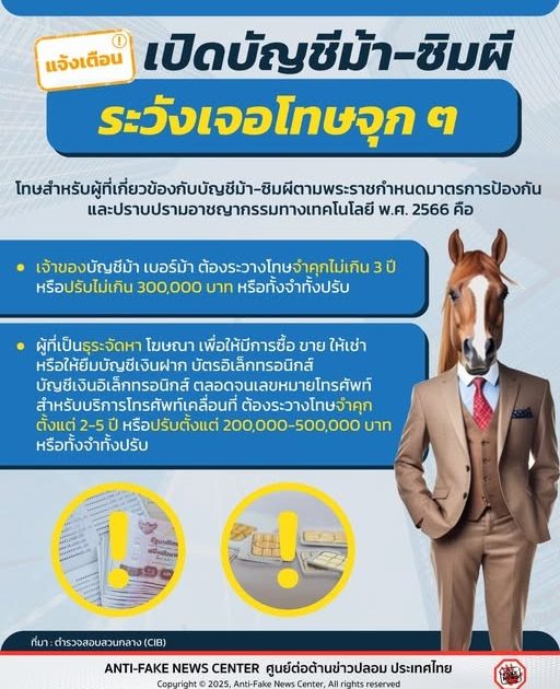 – เจ้าของบัญชีม้า เบอร์ม้า ต้องระวางโทษจำคุกไม่เกิน 3 ปี หรือปรับไม่เกิน 300,000 บาท หรือทั้งจำทั้งปรับ