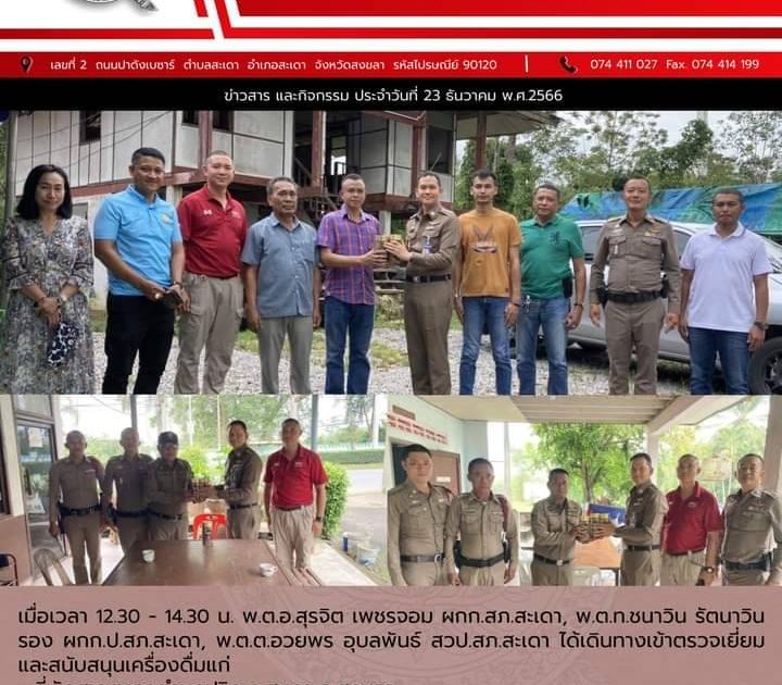 23 ธ.ค. 66 พ.ต.อ.สุรจิต เพชรจอม ผกก.สภ.สะเดา พ.ต.ท.ชนาวิน รัตนาวิน รอง ผกก.ป.สภ.สะเดา พ.ต.ต.อวยพร อุบนพันธ์ สวป.สภ.สะเดา เดินทางตรวจเยี่ยมสายตรวจตำบลปริก สายตรวจตำบลสำนักแต้ว สายตรวจตำบลทุ่งหมอ เพื่อเป็นขวัญกำลังใจพร้อมสนับสนุนเครื่องดื่ม