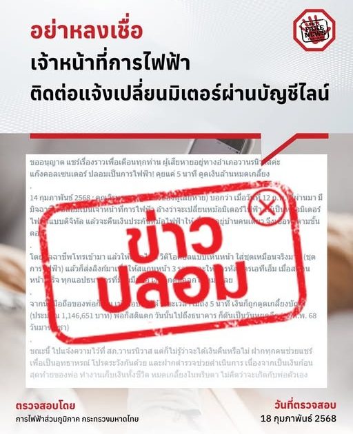 เอ๊ะก่อน อย่าด่วนเชื่อ หากได้รับการติดต่อจากเจ้าหน้าที่แจ้งให้เปลี่ยนมิเตอร์ไฟฟ้าผ่านบัญชีไลน์ ทางการไฟฟ้าส่วนภูมิภาค ขอย้ำเตือนว่า ไม่มีนโยบายติดต่อผู้ใช้ไฟฟ้าผ่านทางแอปพลิเคชันไลน์เพื่อแจ้งการลงทะเบียนเปลี่ยนหรือติดตั้งมิเตอร์ไฟฟ้าแบบอิเล็กทรอนิกส์ ขอให้ผู้ใช้ไฟฟ้าอย่าหลงเชื่อบุคคลหรือผู้แอบอ้างผ่านทางโทรศัพท์หรือแอปพลิเคชันไลน์