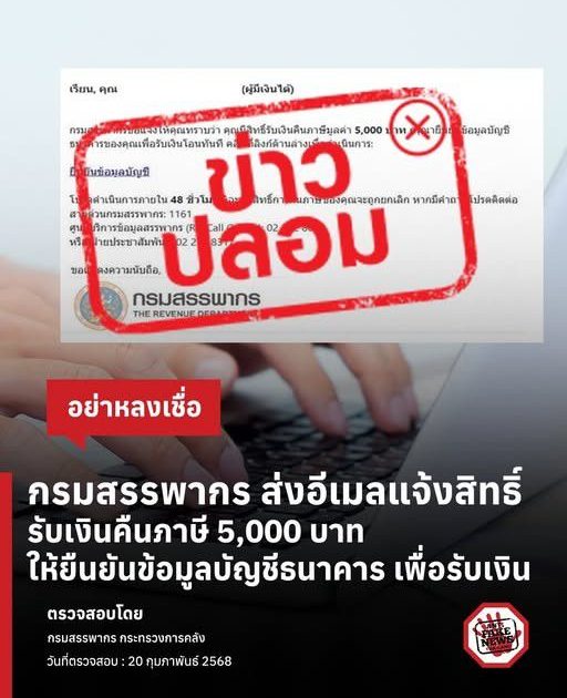 กรมสรรพากร ส่งอีเมลแจ้งสิทธิ์รับเงินคืนภาษี 5,000 บาท ให้ยืนยันข้อมูลบัญชีธนาคารเพื่อรับเงิน