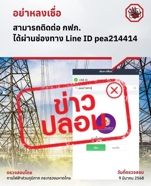 การไฟฟ้าส่วนภูมิภาคขอแจ้งเตือน มิจฉาชีพแอบอ้างการไฟฟ้าส่วนภูมิภาคเปิดบัญชีไลน์ใหม่ ซึ่ง LINE Official Account ของการไฟฟ้าส่วนภูมิภาค คือ LINE @PEA Thailand เท่านั้น ของแท้ต้องมีโล่สีเขียว ไม่ใช่บัญชีไอดีไลน์ pea214414 แต่อย่างใด ขอให้ผู้ใช้ไฟฟ้าอย่าหลงเชื่อ บุคคลหรือผู้แอบอ้างให้แอดไลน์ไอดีดังกล่าว