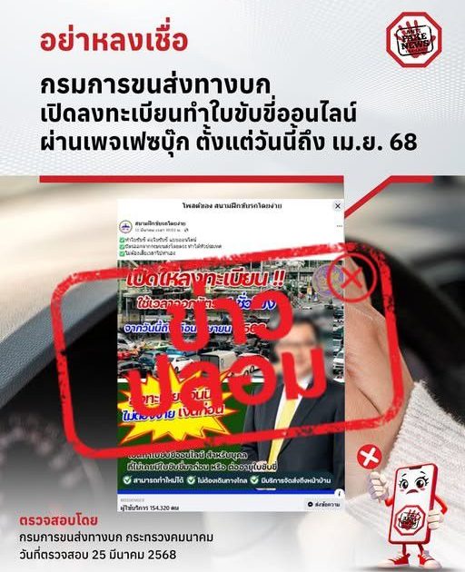 แชร์ไปให้ได้รู้ กรมการขนส่งทางบก ได้เปิดเผยว่า ไม่มีการเปิดให้ลงทะเบียนทำใบขับขี่หรือต่อใบขับขี่ออนไลน์ ถึง เม.ย. 68 ตามโพสต์ในภาพข่าวแต่อย่างใด ข้อมูลโฆษณาชวนเชื่อดังกล่าวเป็นข้อมูลที่มิจฉาชีพจัดทำขึ้น และการทำใบขับขี่นั้น ผู้ขอรับใบอนุญาตขับรถต้องดำเนินการด้วยตนเองทุกขั้นตอนที่สำนักงานขนส่งเท่านั้น