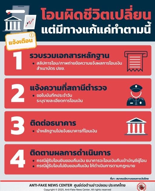 – นำหลักฐานทั้งหมดไปแจ้งธนาคารที่ทำการโอนเงิน