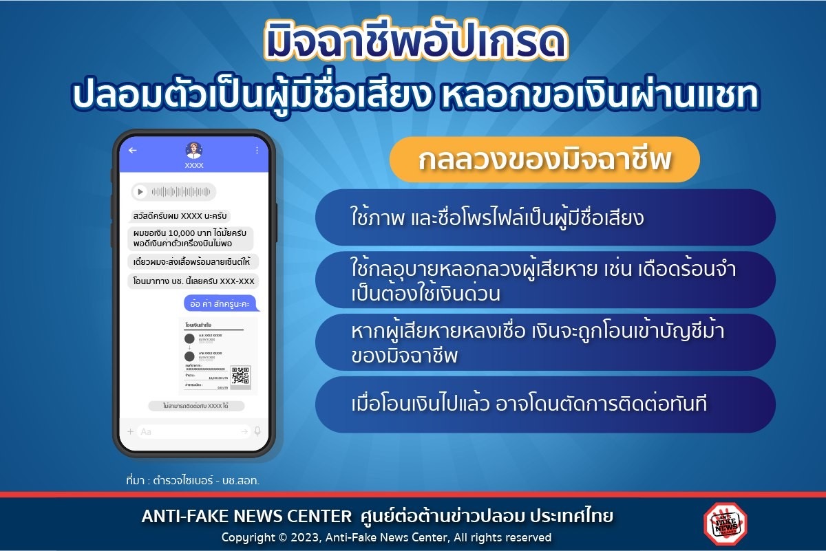 มิจฉาชีพอัปเกรด ปลอมตัวเป็นคนมีชื่อเสียง หลอกขอเงินผ่านแชท.ประชาชนพึงระวัง และควรมีสติทุกครั้งเมื่อท