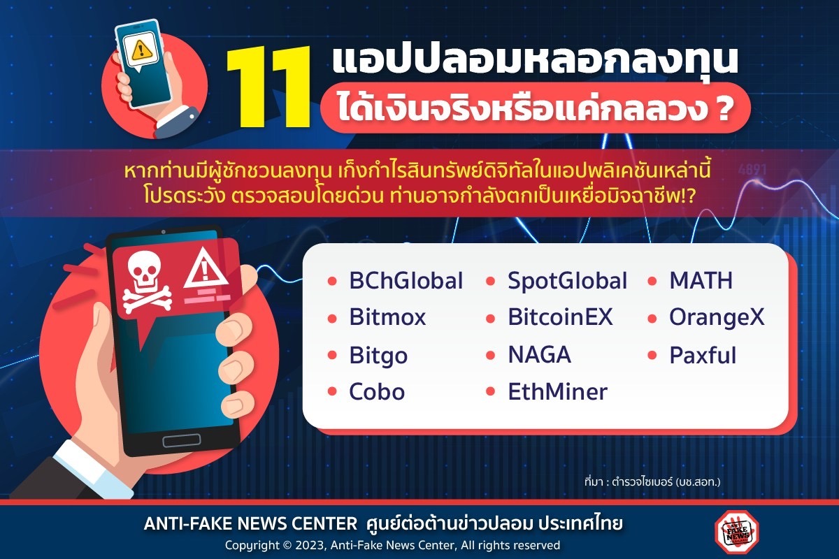 11 แอปปลอมหลอกลงทุน ได้เงินจริงหรือแค่กลลวง?.หากท่านมีผู้ชักชวนลงทุน เก็งกำไรสินทรัพย์ดิจิทัลในแอปพล