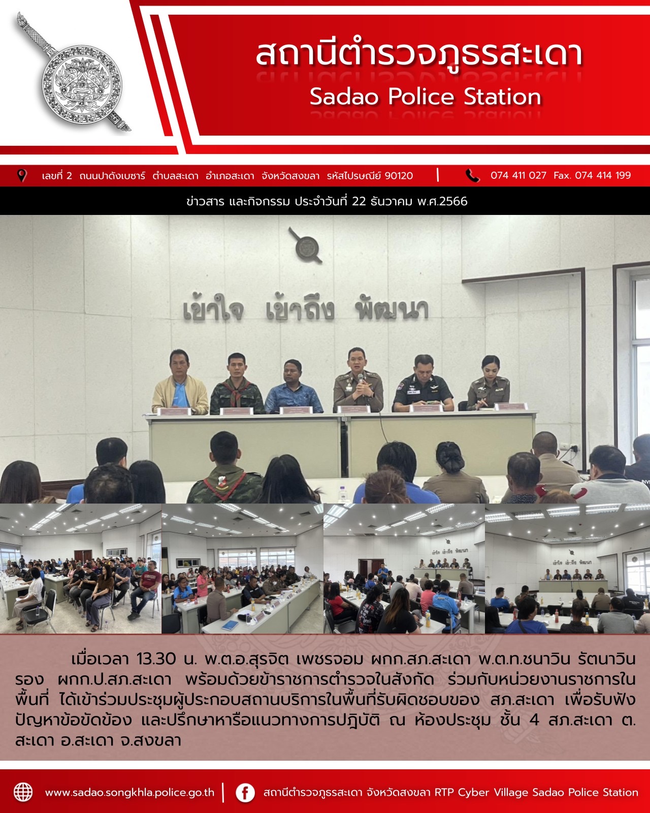 ประชุมผู้ประกอบการ 22 ธ.ค. 66 พ.ต.อ.สุรจิต เพชรจอม ผกก.สภ.สะเดา พ.ต.ท.ชนาวิน รัตนาวิน รอง ผกก.ป.สภ.ส