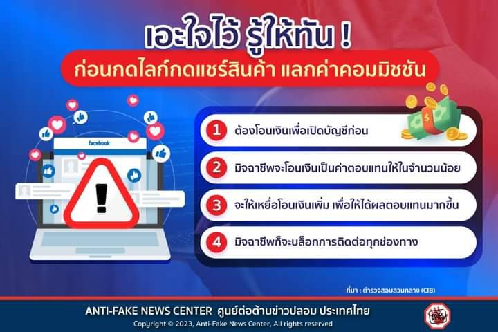 25 ต.ค.66 เอะใจไว้ รู้ให้ทัน! ก่อนกดไลก์กดแชร์สินค้า แลกค่าคอมมิชชัน.ขณะนี้มีมิจฉาชีพหลอกลงทุนออนไลน