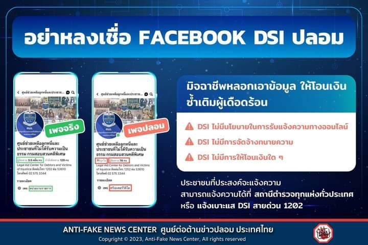 วันที่ 3 ต.ค.2566 อย่าหลงเชื่อ FACEBOOK DSI ปลอม.มีผู้ไม่ประสงค์ดี สร้างเพจเฟซบุ๊กในชื่อศูนย์ช่วยเหล