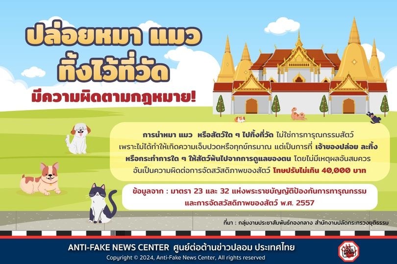 2 ตุลาคม 2566 ปล่อยหมา แมว ทิ้งไว้ที่วัด มีความผิดตามกฎหมาย!.การนำหมา แมว หรือสัตว์ใด ๆ ไปทิ้งที่วัด