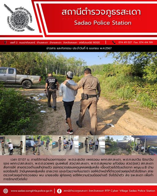 วันที่ 6 เม.ย.67 เวลา 07.07 น. ภายใต้การอำนวยการของ พ.ต.อ.สุรจิต เพชรจอม ผกก.สภ.สะเดา, พ.ต.ท.ชนาวิน