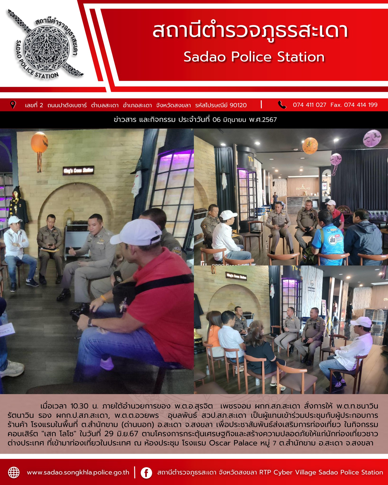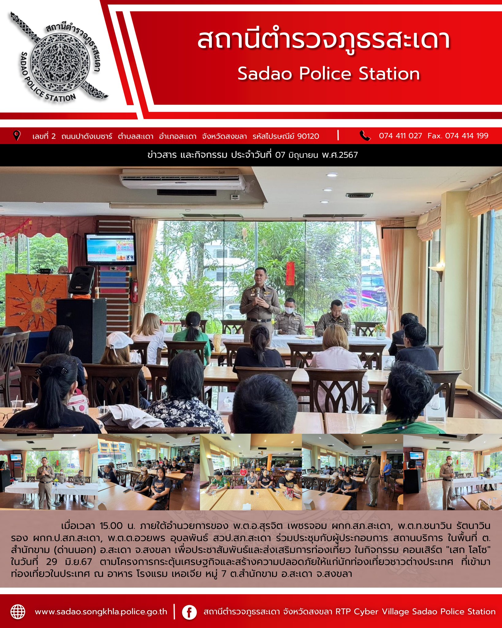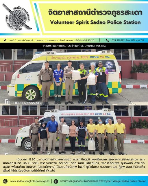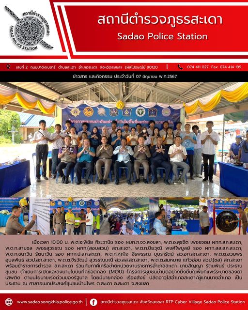 7 มิถุนายน 2567 เวลา 15.00 น. ภายใต้อำนวยการของ พ.ต.อ.สุรจิต เพชรจอม ผกก.สภ.สะเดา, พ.ต.ท.ชนาวิน รัตน