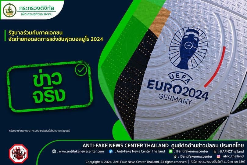 12 มิถุนายน 2567 รัฐบาลร่วมกับภาคเอกชน จัดถ่ายทอดสดการแข่งขันฟุตบอลยูโร 2024 จริงหรือ?.จากที่มีประเด