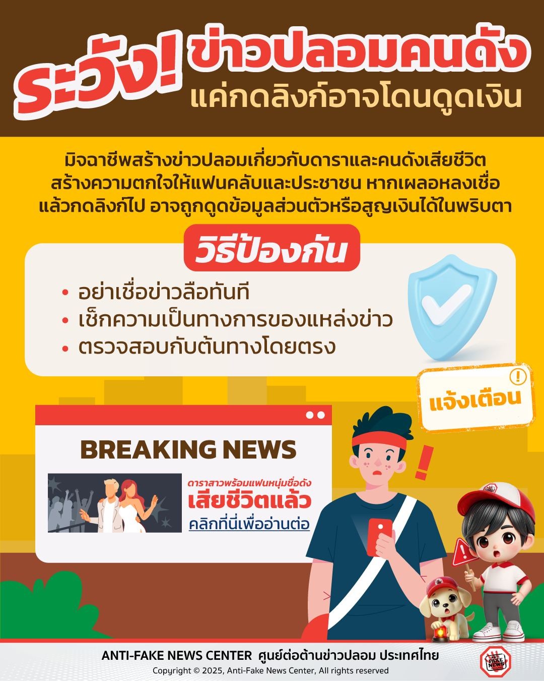 2 ต.ค.68 ระวัง! ข่าวปลอมคนดัง แค่กดลิงก์อาจโดนดูดเงิน . ปัจจุบันมิจฉาชีพมีวิธีการหลากหลายในการหลอกลว