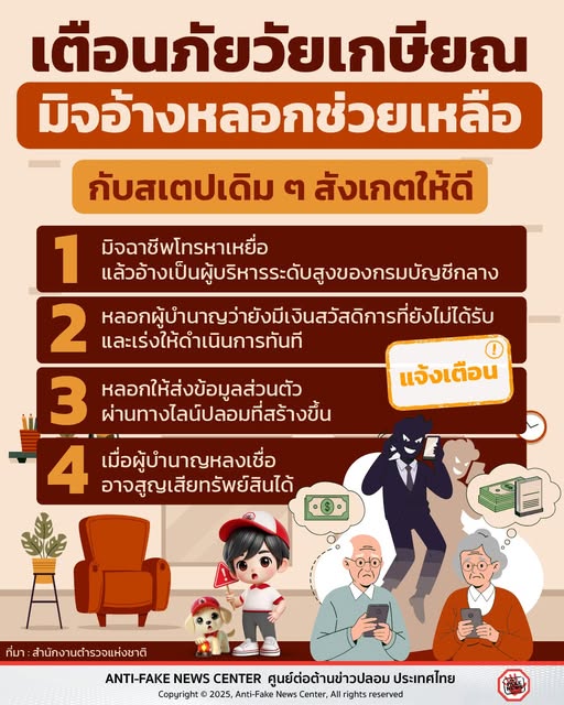 4 พ.ย.68 เตือนภัยวัยเกษียณ มิจอ้างหลอกช่วยเหลือ . กรมบัญชีกลางเตือนให้ผู้สูงอายุ วัยเกษียณ ผู้รับบำน