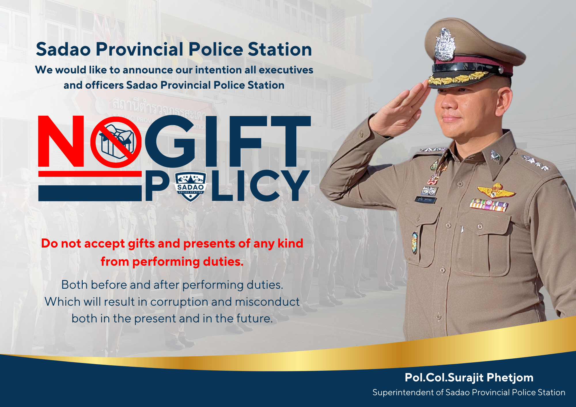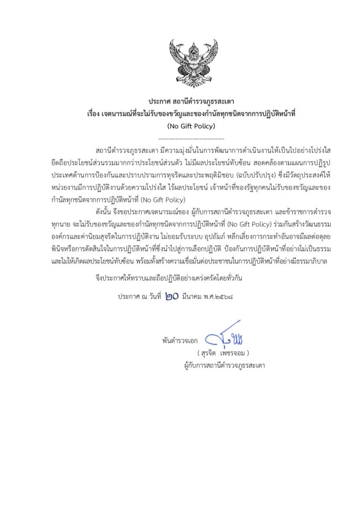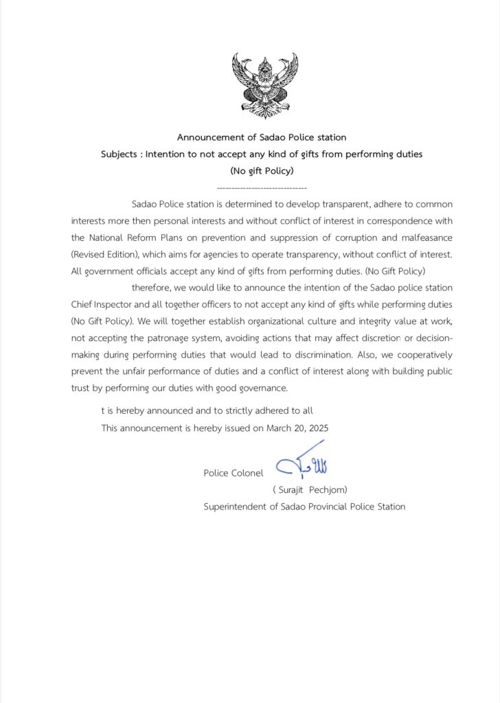 O18 ประกาศนโยบายต่อต้านการรับสินบน (Anti-Bribery Policy) และนโยบายไม่รับของขวัญและของกำนัลทุกชนิด (No Gift Policy) จากการปฏิบัติหน้าที่