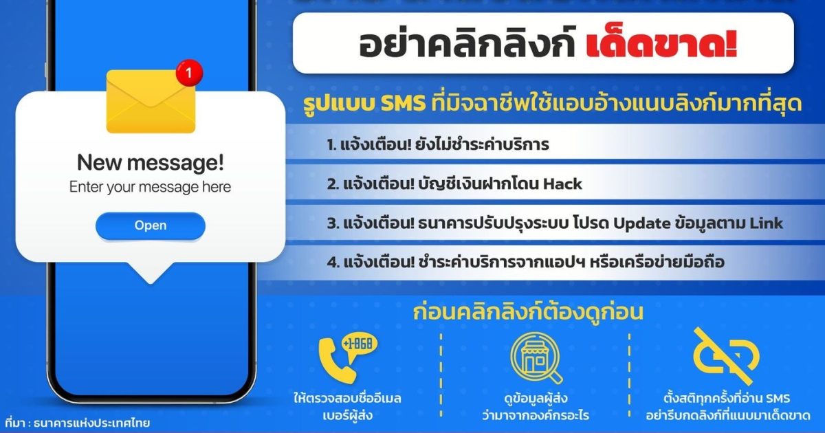 เตือนภัย SMS กลลวงจากมิจฉาชีพที่สวมตัวอ้างเป็นเจ้าหน้าที่รัฐ หรือบริษัทต่าง ๆ โดยจะมีการแนบลิงก์ใน SMS มาเสมอ